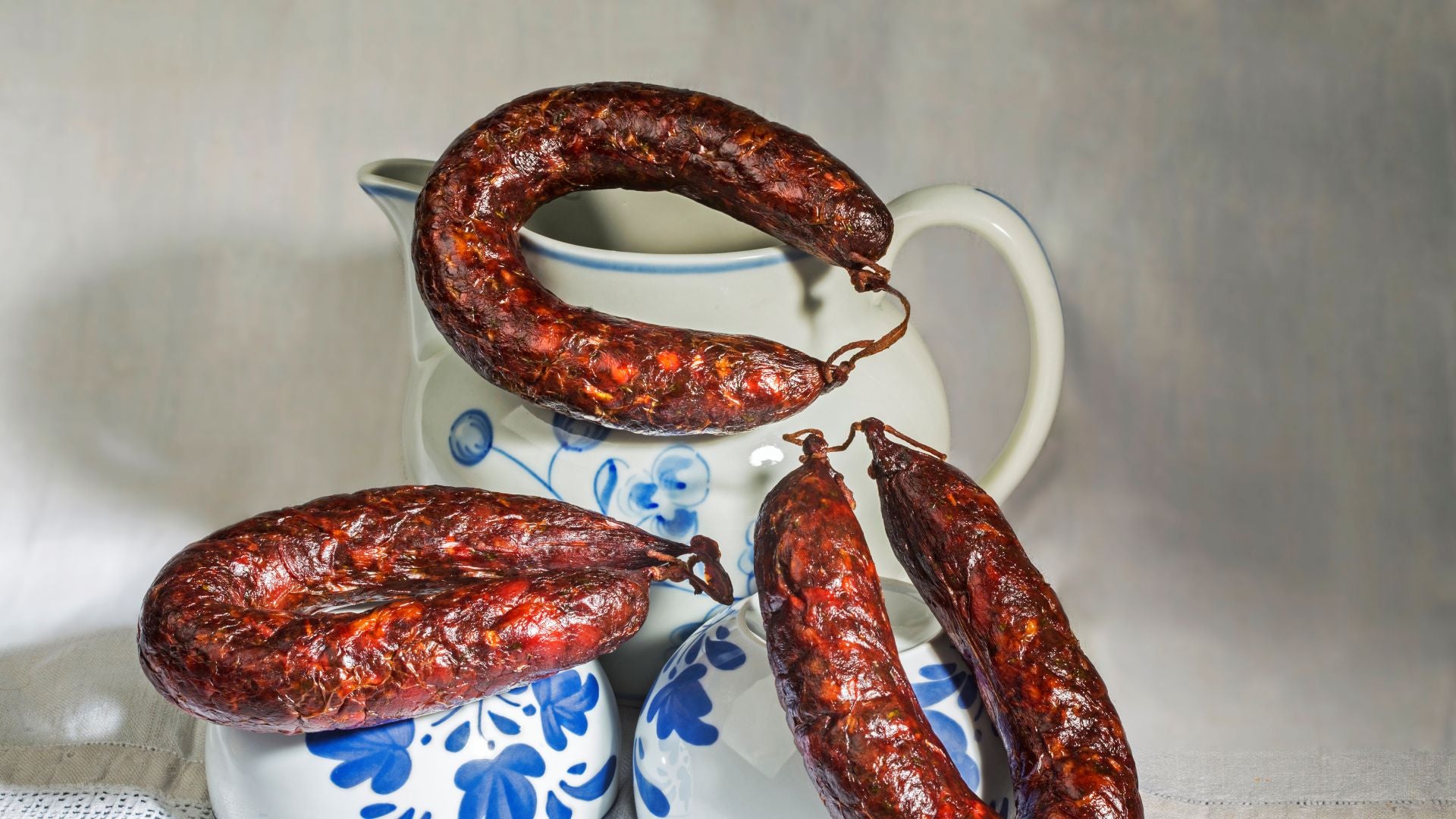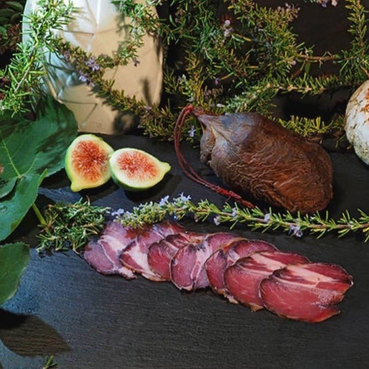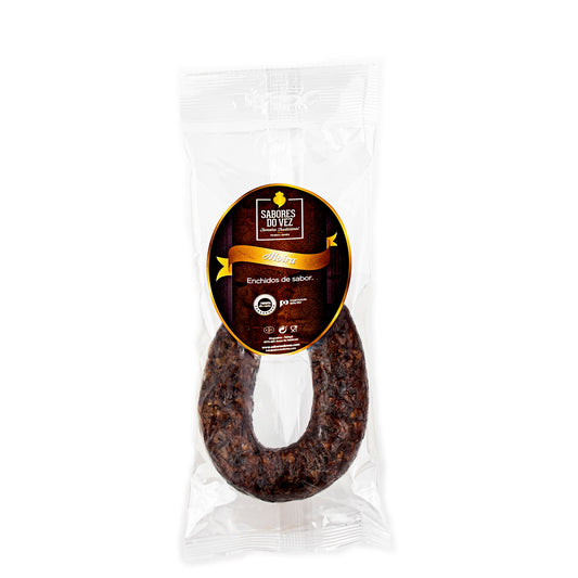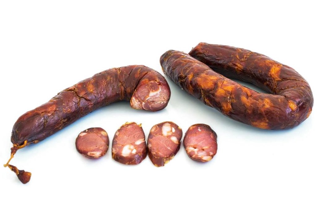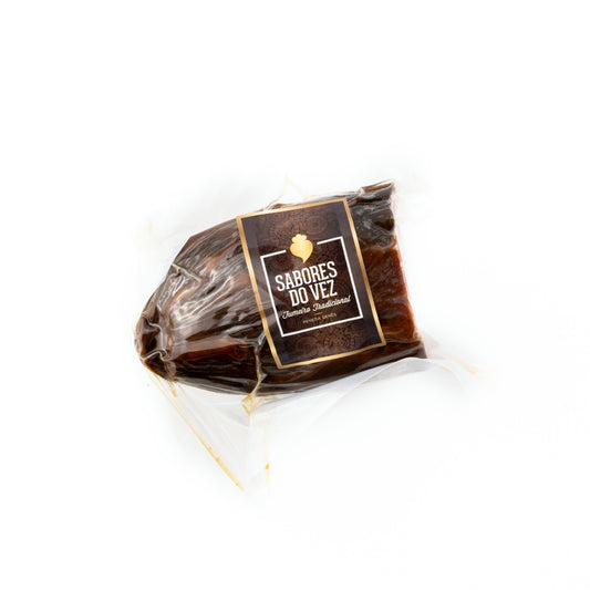 Ensacado fumado constituído por uma única peça de cachaço de porco fumado lentamente em lenha de carvalho.